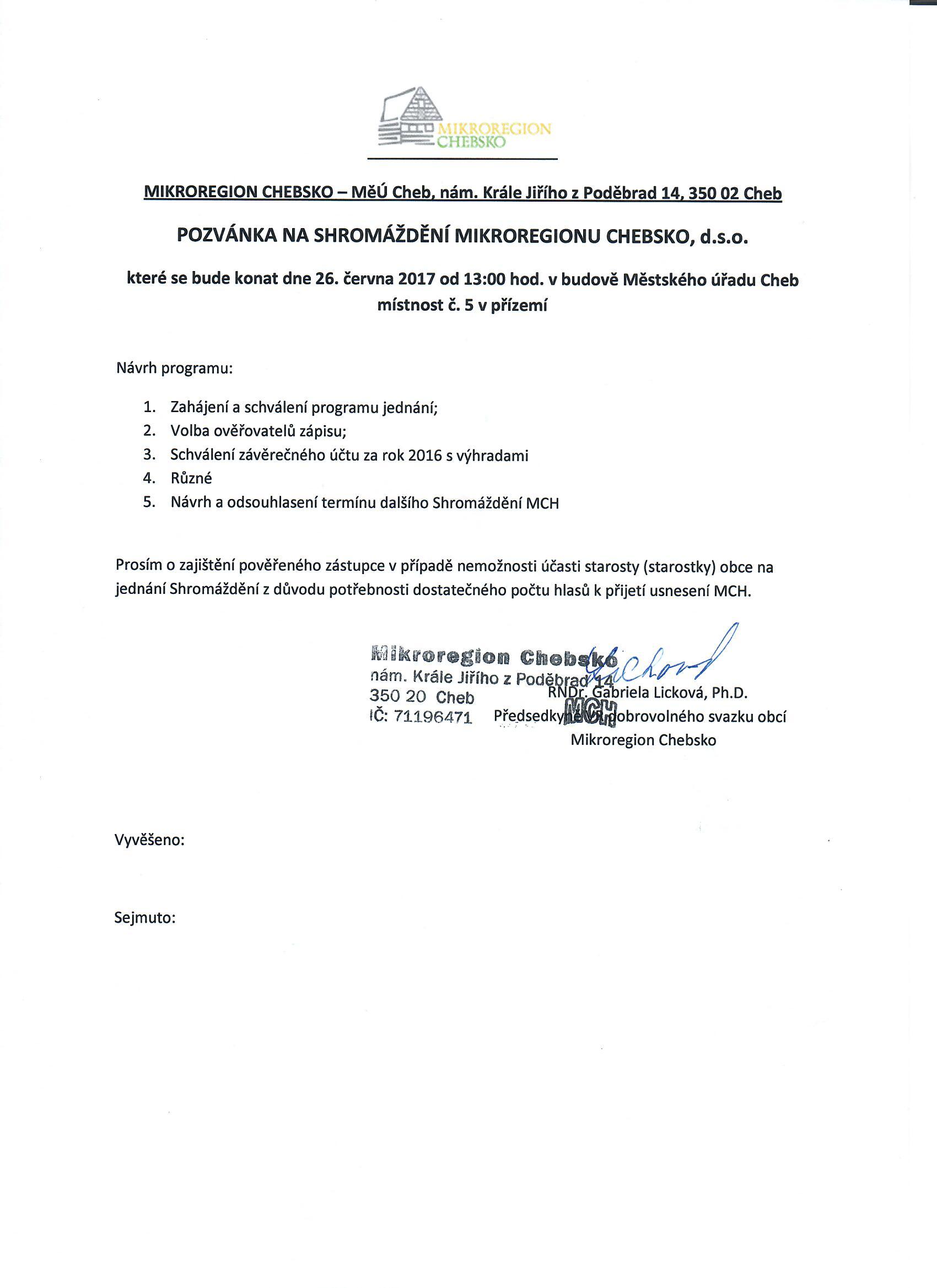 Pozvánka na shromáždění Mikroregionu Chebsko 26.6.2017