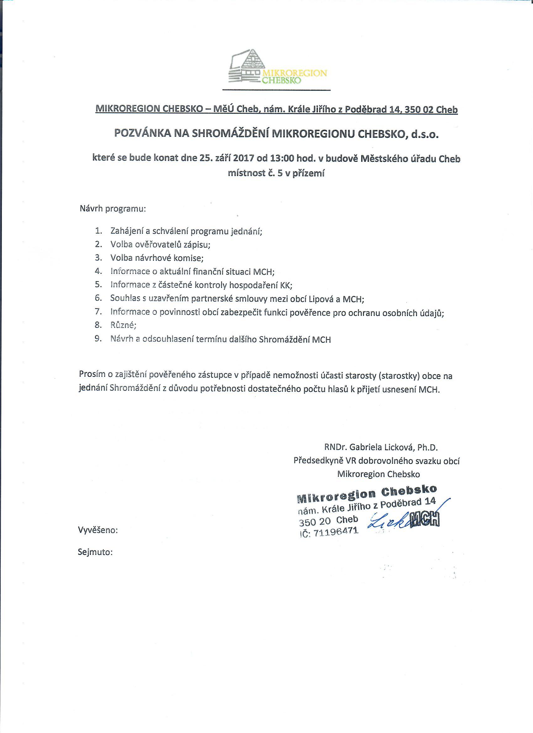 Pozvánka na shromáždění Mikroregionu Chebsko 25.9.2017